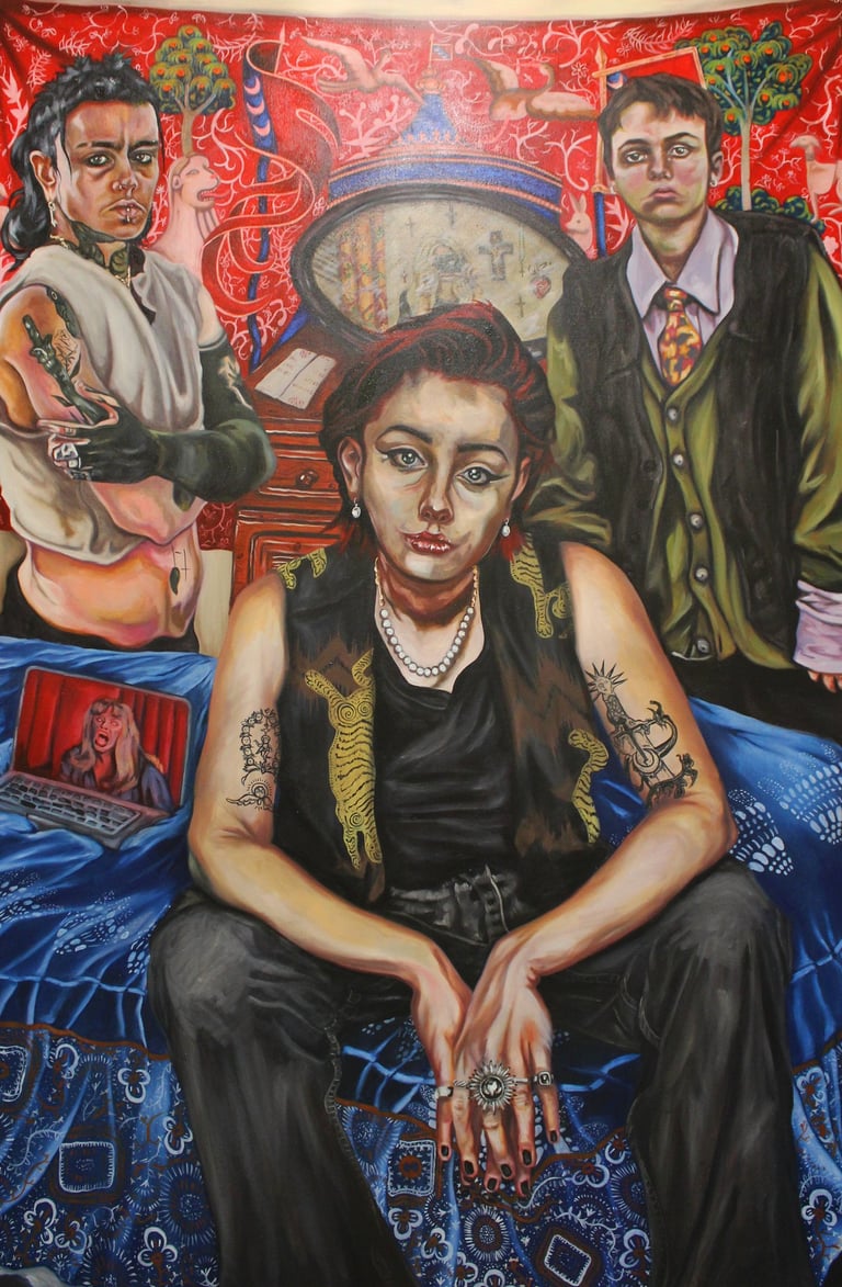 The Ambassadors is a self-portrait of the artist surrounded by their queer community of friends, acting as a survey of queer life and a snapshot of their ever evolving identities and bodies.
